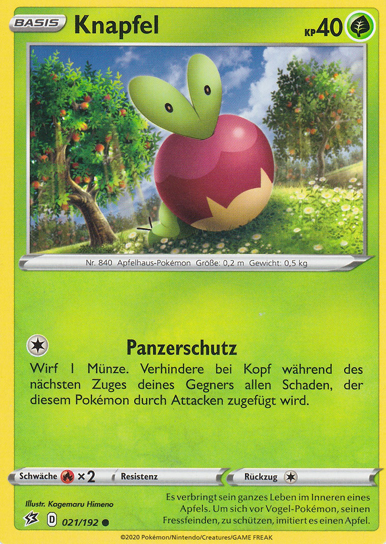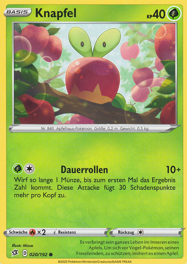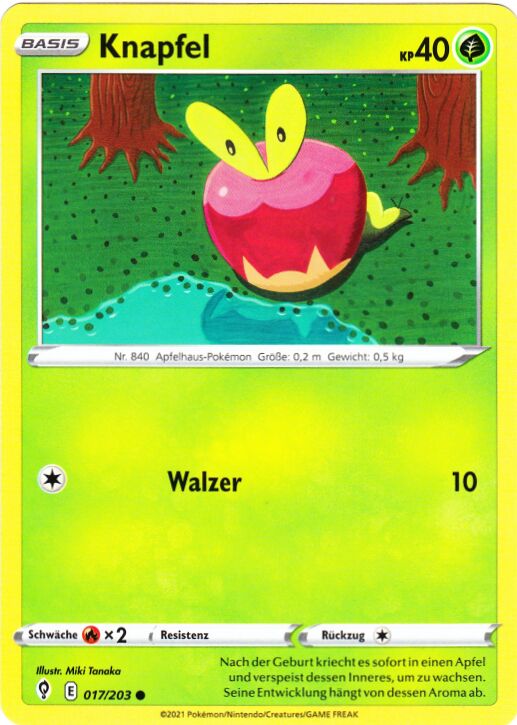 - SW Es verbringt sein ganzes Leben im Inneren eines Apfels. Um sich vor Vogel-Pokémon, seinen Fressfeinden, zu schützen, imitiert es einen Apfel.