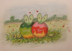 - P Dieses Pokémon lebt im Inneren eines Apfels. Ohne diesen verliert sein Körper Flüssigkeit, wodurch es schwächer wird.