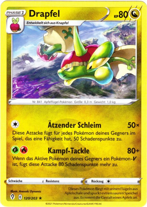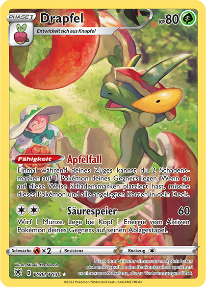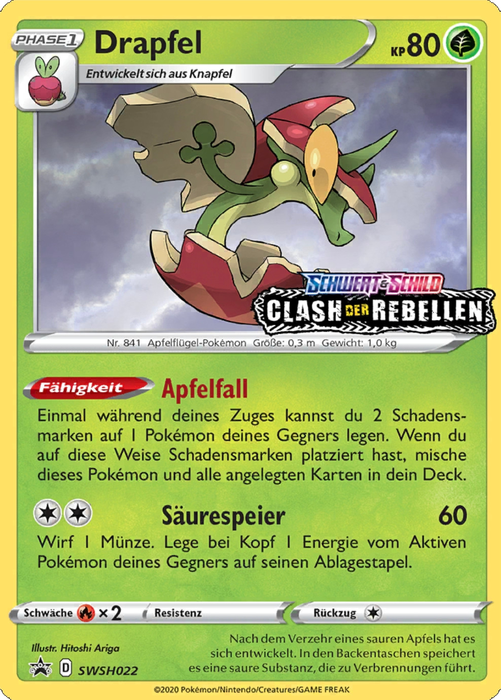 - SH Dieses Pokémon fliegt mit seinen Flügeln aus Apfelschale und spuckt extrem sauren Speichel aus. Es nimmt die Gestalt eines Apfels an.