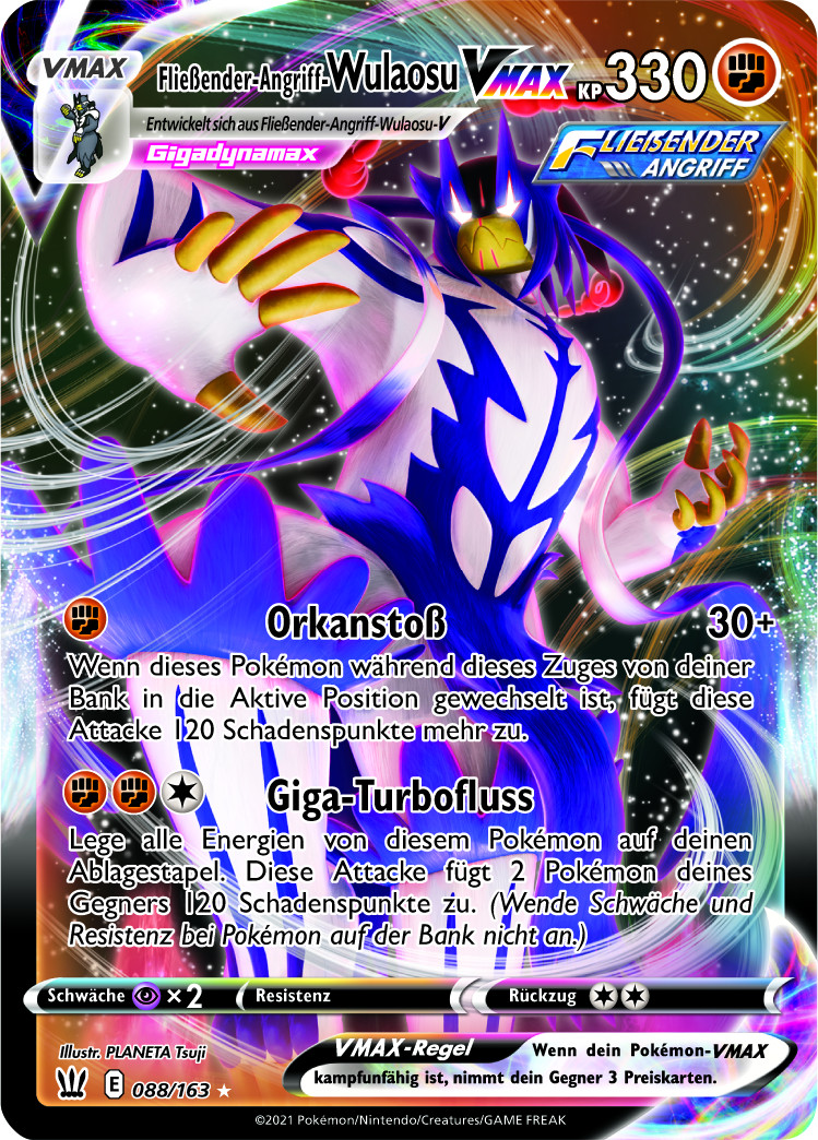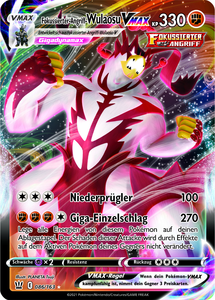 -Version verfügen. Fokussierter-Angriff-Wulaosu VMAX hat eine Attacke, die mit Hilfe von ein paar verfügbaren Verstärkungen nahezu alles mit einem Schlag ausknocken kann, und lehrt damit dem berüchtigten Arceus & Dialga & Palkia TAG TEAM GX nicht nur mit der überlegenen Länge seines Kartennamens das Fürchten.