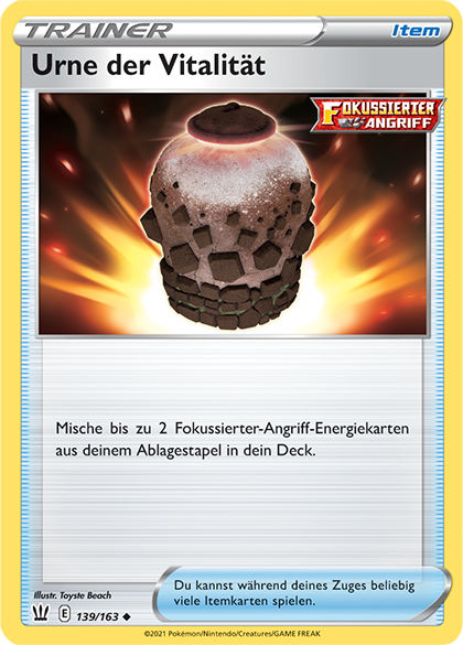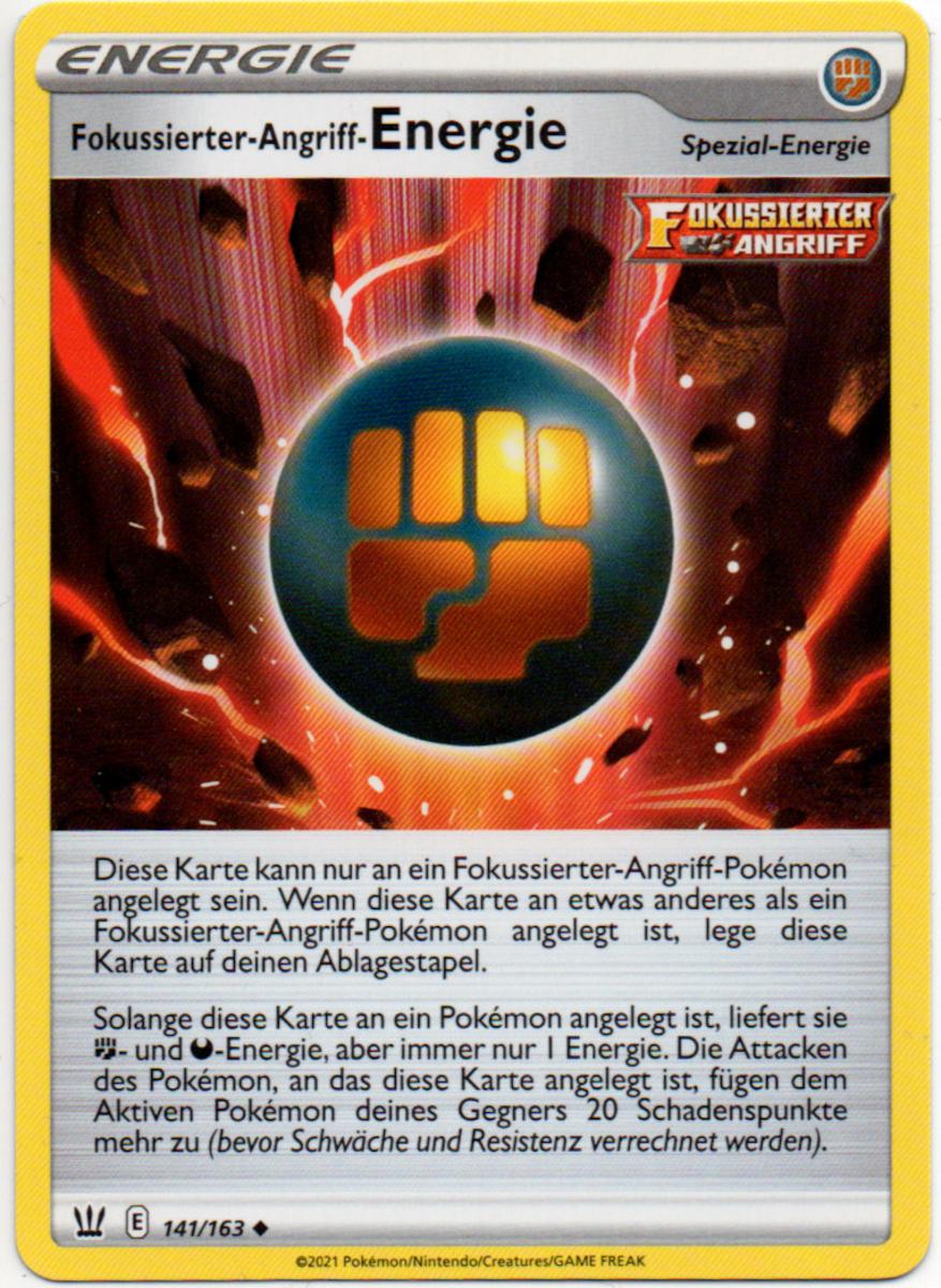 Das Finsternis-Kampf-Gegenstück dazu, die Fokussierter-Angriff-Energie, gewährt zwar nur eine Energie, verstärkt aber dafür den Angriffsschaden des entsprechenden Fokussierter-Angriff-Pokémon um 20 – ganz ähnlich wie die kürzlich erschienene Kraft-Farblos-Energie. Darüber hinaus kann sie auch mit dem schon erwähnten Hundemon direkt aus dem Deck ins Spiel gebracht und sogar mit der neuen Itemkarte Urne der Vitalität wiederverwertet werden.