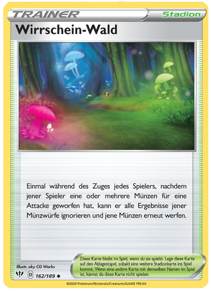 Attacken mit Münzwürfen sind immer ziemlich riskant. Früher konnte Victini hier helfen, jetzt erlaubt die Stadionkarte Wirrschein-Wald, einen gescheiterten Münzwurf beim Angriff zu wiederholen. Ein typisches Beispiel für eine eigentlich symmetrische Karte, die je nach Deck dennoch gut zum eigenen Vorteil genutzt werden kann, denn viele Gegner können nur wenig Nutzen daraus ziehen.