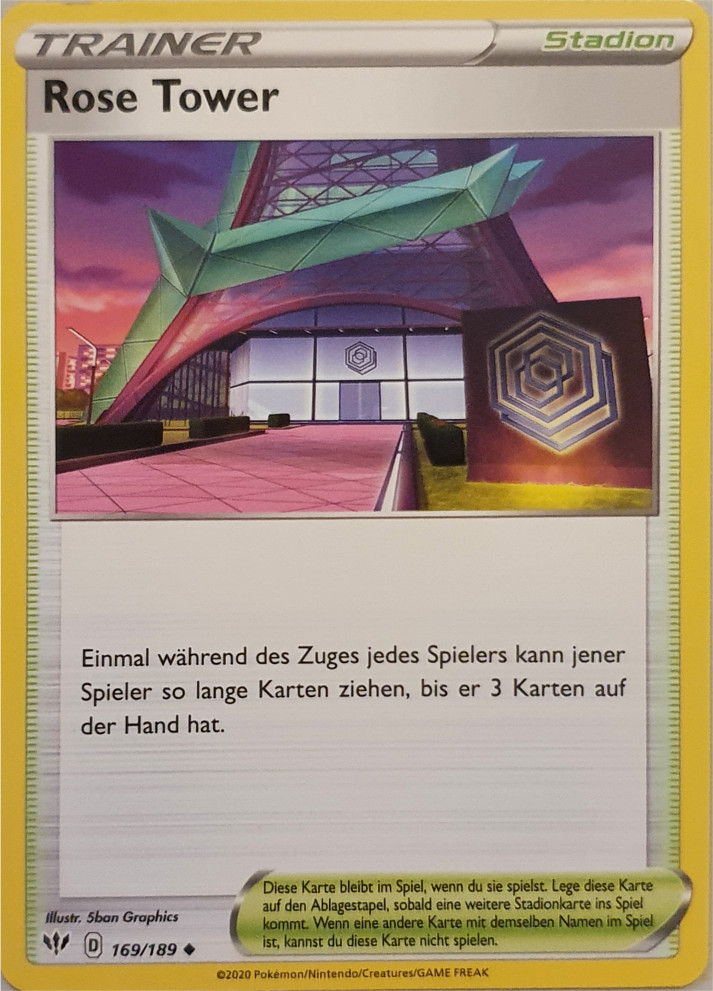 Eure Handkarten sind weg? Rose Tower schafft hier Abhilfe, indem ihr damit jeder Runde bis auf drei Karten aufziehen dürft. Natürlich kann auch euer Gegner diese Stadionkarte nutzen, deshalb macht sie nur Sinn, wenn ihr mit eurem Deck oft eine kleine Anzahl von Handkarten erwartet – beispielsweise indem ihr viel abwerft. Rose selbst hat als kostspieligen Nebeneffekt für seine VMAX-Energiebeschleunigung, dass ihr eure ganze Hand verliert und sollte daher idealerweise nur gespielt werden, wenn sein Turm auch bereitliegt.