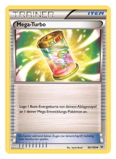 Mit diesem praktischen Item können wir eine Basis-Energiekarte von unserem Ablagestapel an eines unserer Mega Rayquaza EX anlegen. Das ist wichtig, denn dies erlaubt uns, unser Rayquaza mit der zusätzlichen Hilfe von einer Doppel-Farblos-Energie, die wir regulär anlegen können, in einem einzigen Zug aufzuladen. Meistens werden 3 bis 4 Mega-Turbos gespielt.