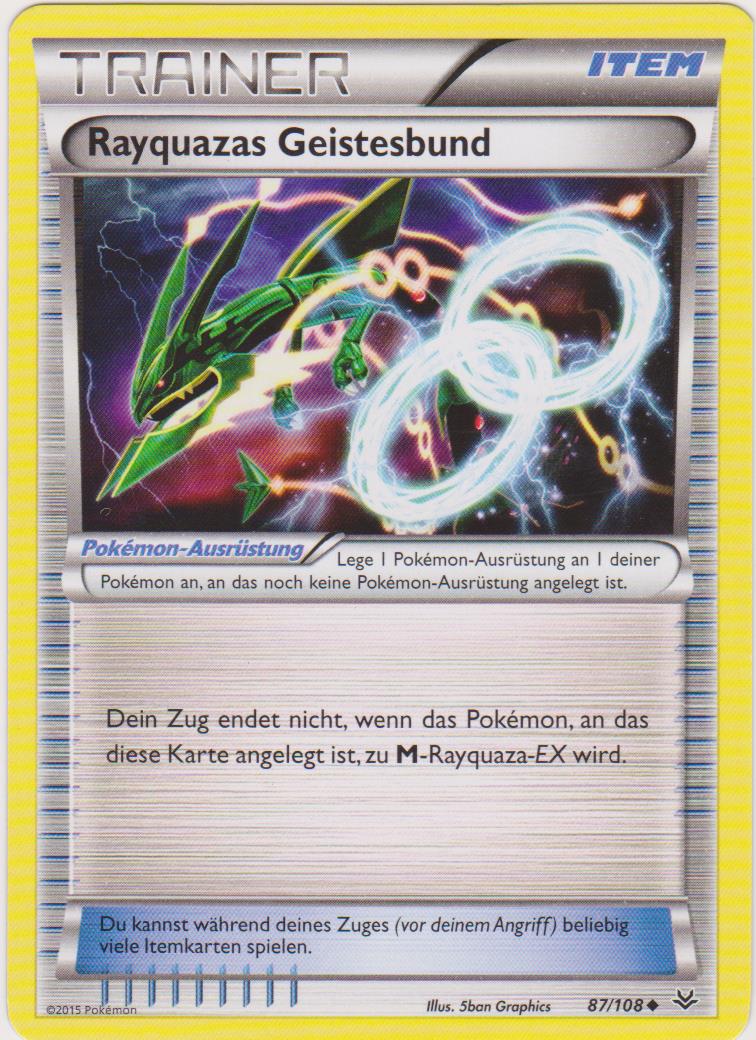 Wie fast alle Mega-Entwicklungen, besitzt auch Rayquaza eine Geistesbund-Ausrüstung. Mit dieser wird unser Spielzug nicht direkt beendet, wenn wir ein Rayquaza mit dieser Ausrüstungskarte weiterentwickeln. Durch die bereits erwähnte Eigenschaft “Delta-Entwicklung” sowie der Ausrüstung können wir unseren Drachen im ersten Spielzug bereits entwickeln, ohne das unser Spielzug beendet wird.