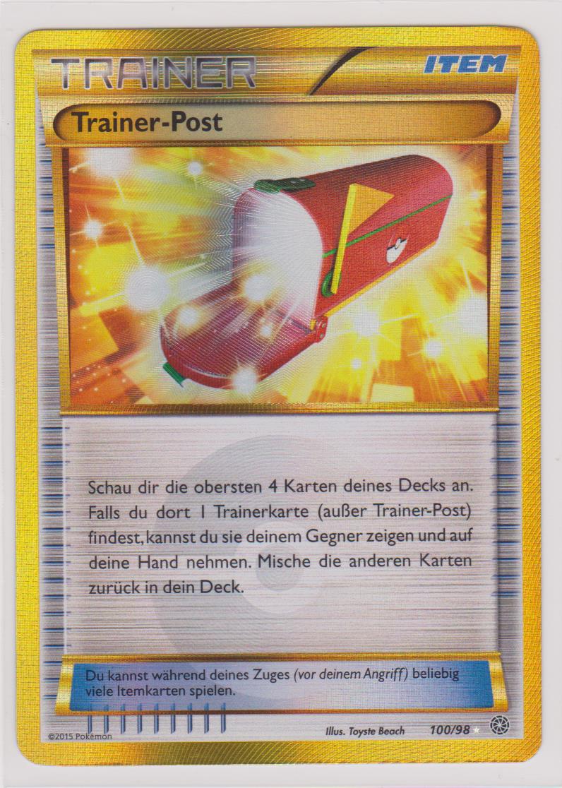 In dieser Version spiele ich Blitza EX. Dieses hilft uns gegen Basis-Pokemon lastige Decks, wie Darkrai EX, Volcanion EX sowie Wasser-Toolbox. Zudem habe ich mich in dieser Version dazu entschieden, 3 Trainers-Post sowie 4 Zeitpuzzle zu spielen, was gut funktioniert. Um zuverlässiger ein zweites Zeitpuzzle auf die Hand zu bekommen, spiele ich eine Géraldine im Deck.