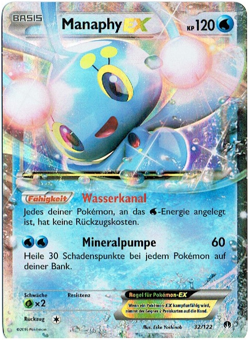 Durch Manaphy EX und die Fähigkeit “Wasserkanal” besitzt jedes unserer Pokemon keine Rückzugskosten mehr, wenn eine Wasser-Energie angelegt. Zudem haben wir mit dem Glaziola EX das Gegenstück zu Blitza EX. Glaziola EX schützt uns mit dem Angriff “Kristallstrahl” vor den Angriffen entwickelter Pokemon.