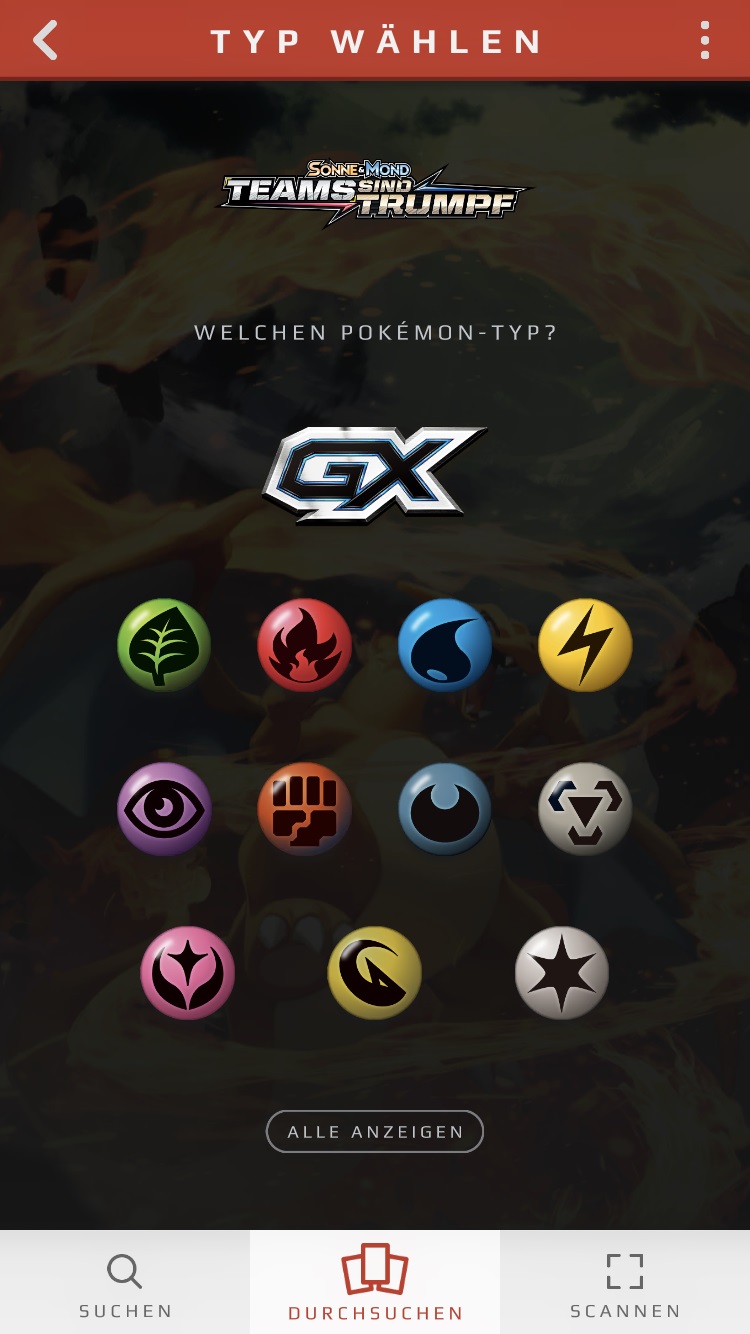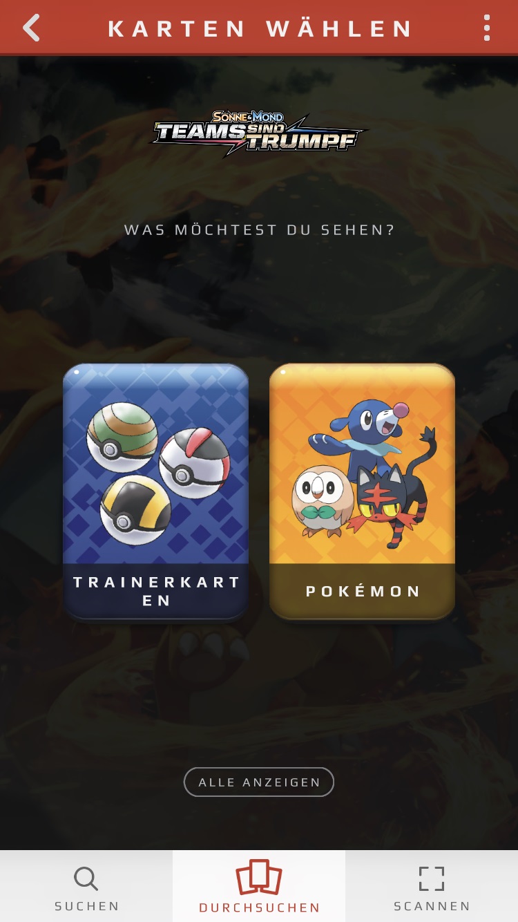 Klickt ihr eine Erweiterung an, könnt ihr auswählen, welchen Kartentyp ihr sehen wollt: Trainer-Karten oder Pokémon. Wählt ihr letzteres aus,