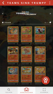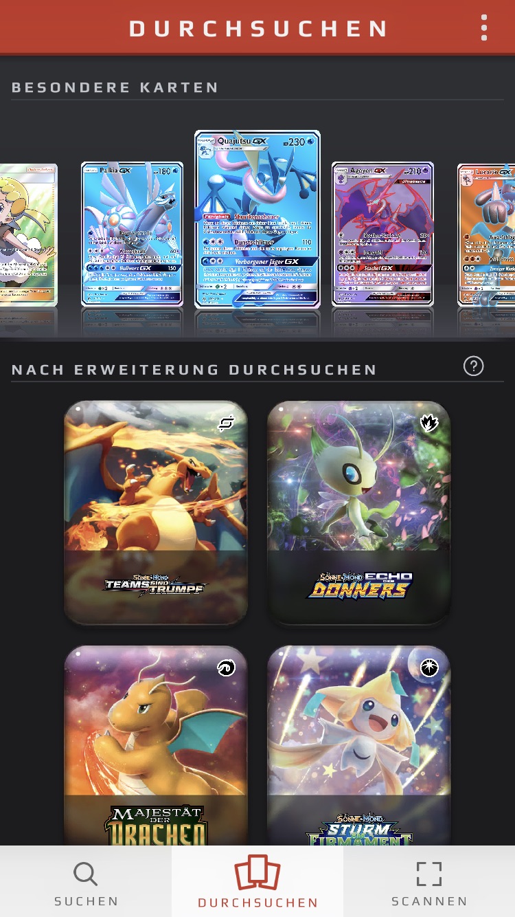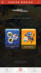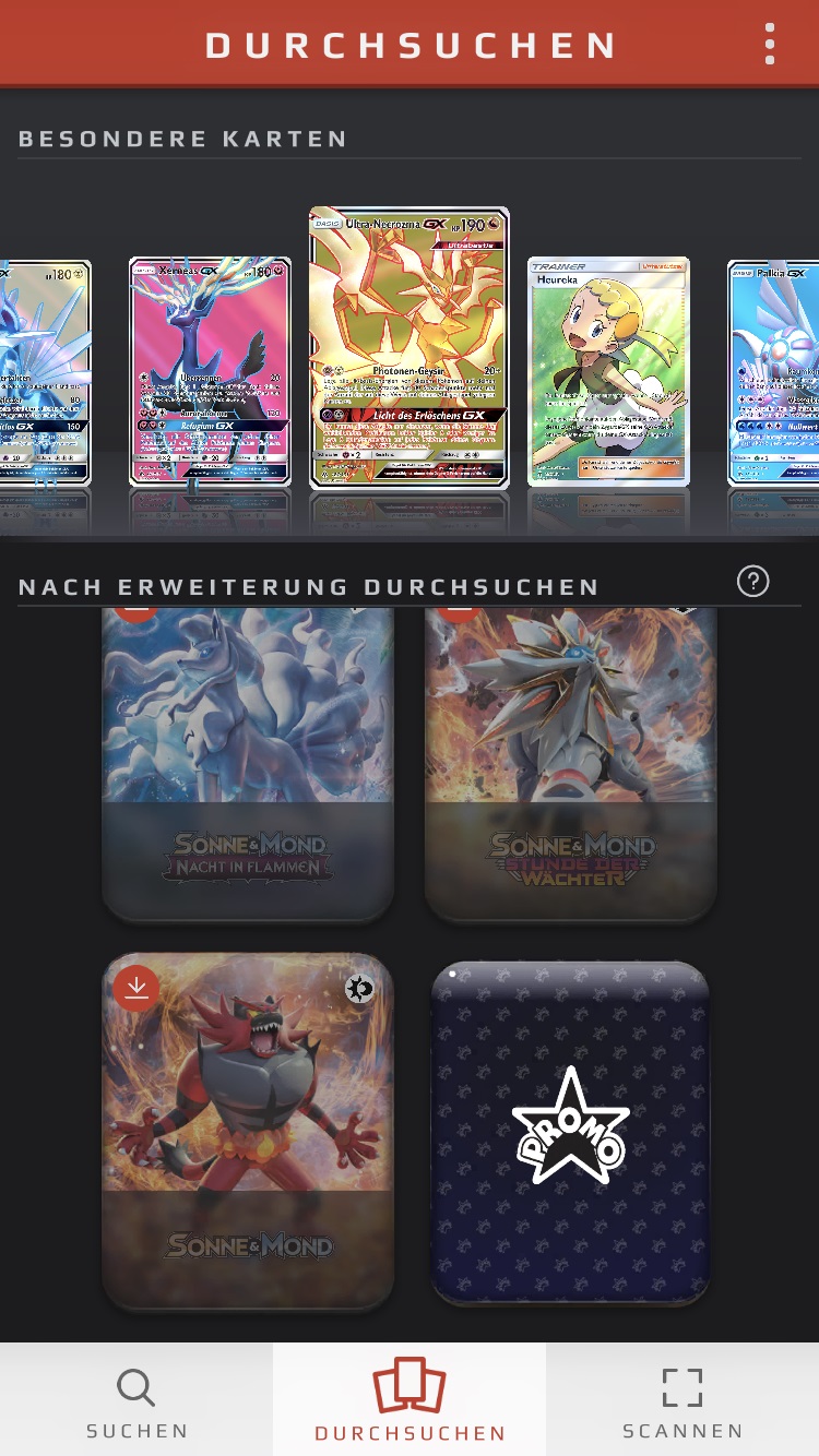 Habt ihr die App heruntergeladen und öffnet sie, so landet ihr direkt im „Durchsuchen“-Menü (den Menüpunkt könnt ihr auch am unteren Rand auswählen), in welchem ihr im oberen Teil des Bildschirm „Besondere Karten“ in einer Slideshow angezeigt bekommt. Diese könnt ihr auswählen, um einen vergrößerten Scan der Karte angezeigt zu bekommen.