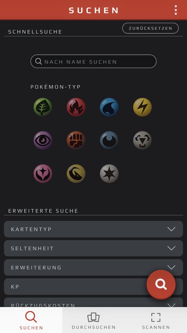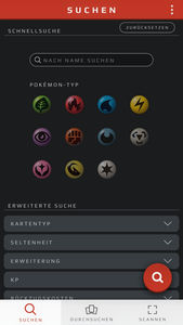 Ebenfalls könnt ihr Karten in der Datenbank suchen. Wählt dazu unten den linken Menüpunkt „Suchen“ aus. Dabei könnt ihr über die Schnellsuche nach „Name“ und „Pokémon-Typ“ der Karten suchen und mit der erweiterten Schnellsuche könnt ihr sogar Kartentexte auf Stichworte durchsuchen. In der erweiterten Suche sind euch wesentlich feinere Suchmöglichkeiten an die Hand gegeben - hier ist eine Suche nach den Attributen „Kartentyp“, „Seltenheit“, „Erweiterung“, „KP“, „Rückzugskosten“, „Gesamte Attackenkosten“, „Schwäche und Resistenz“ sowie „Energietyp in Attackenkosten“ möglich - sofern ihr über solche Informationen verfügt. Klickt ihr nach eurer Suchkriterienauswahl auf die rote Lupe rechts unten, werden euch die Karten angezeigt, auf die eure gewählten Kriterien zutreffen. Beachtet aber, dass euch nur Karten jener Erweiterungen angezeigt werden, die ihr bereits heruntergeladen habt.