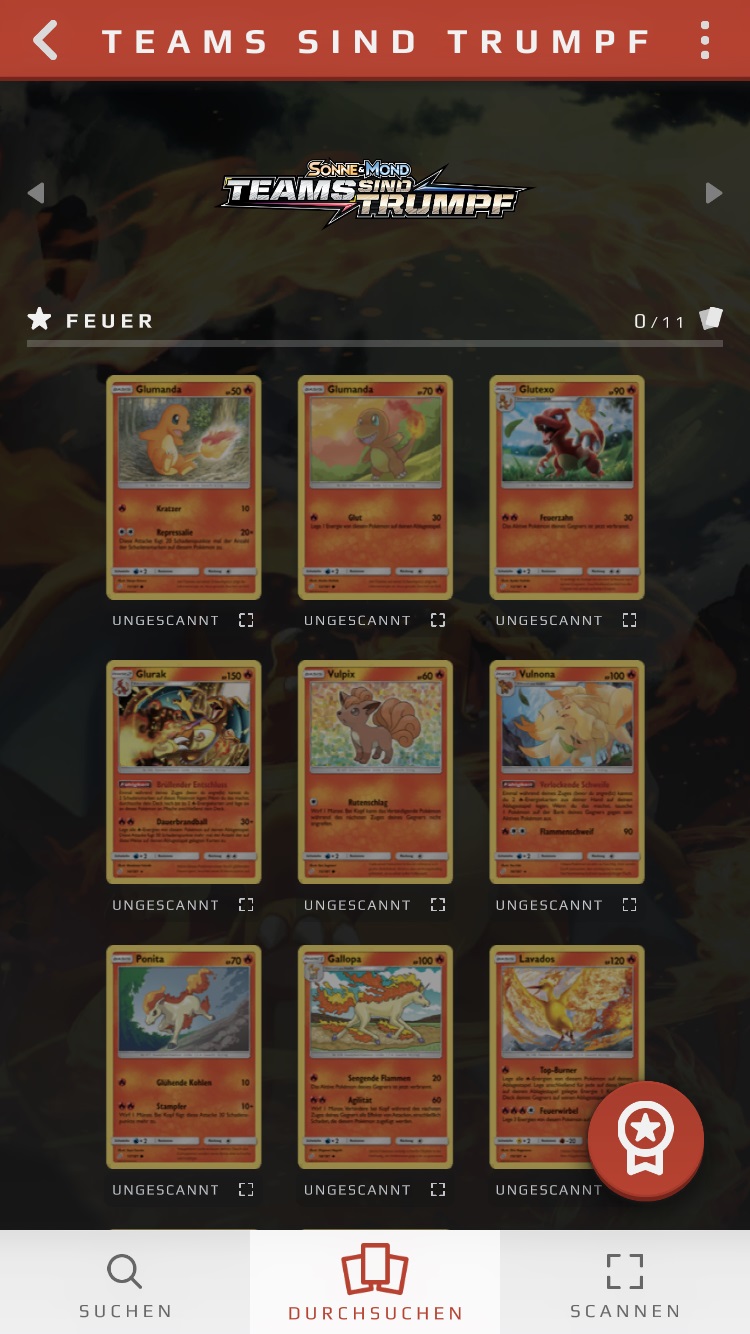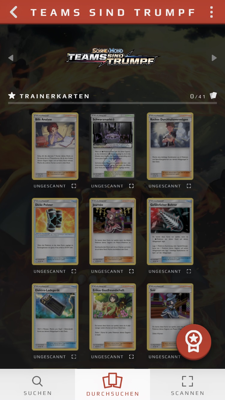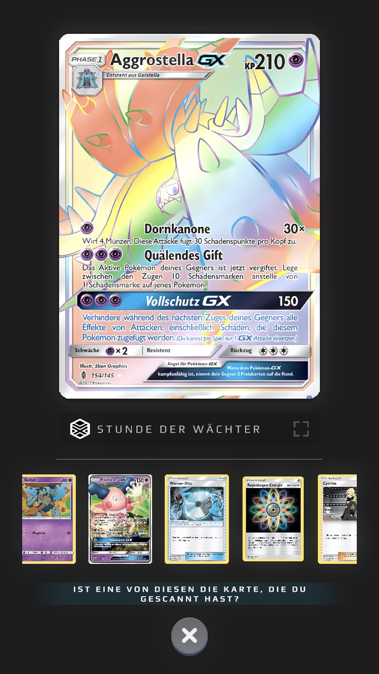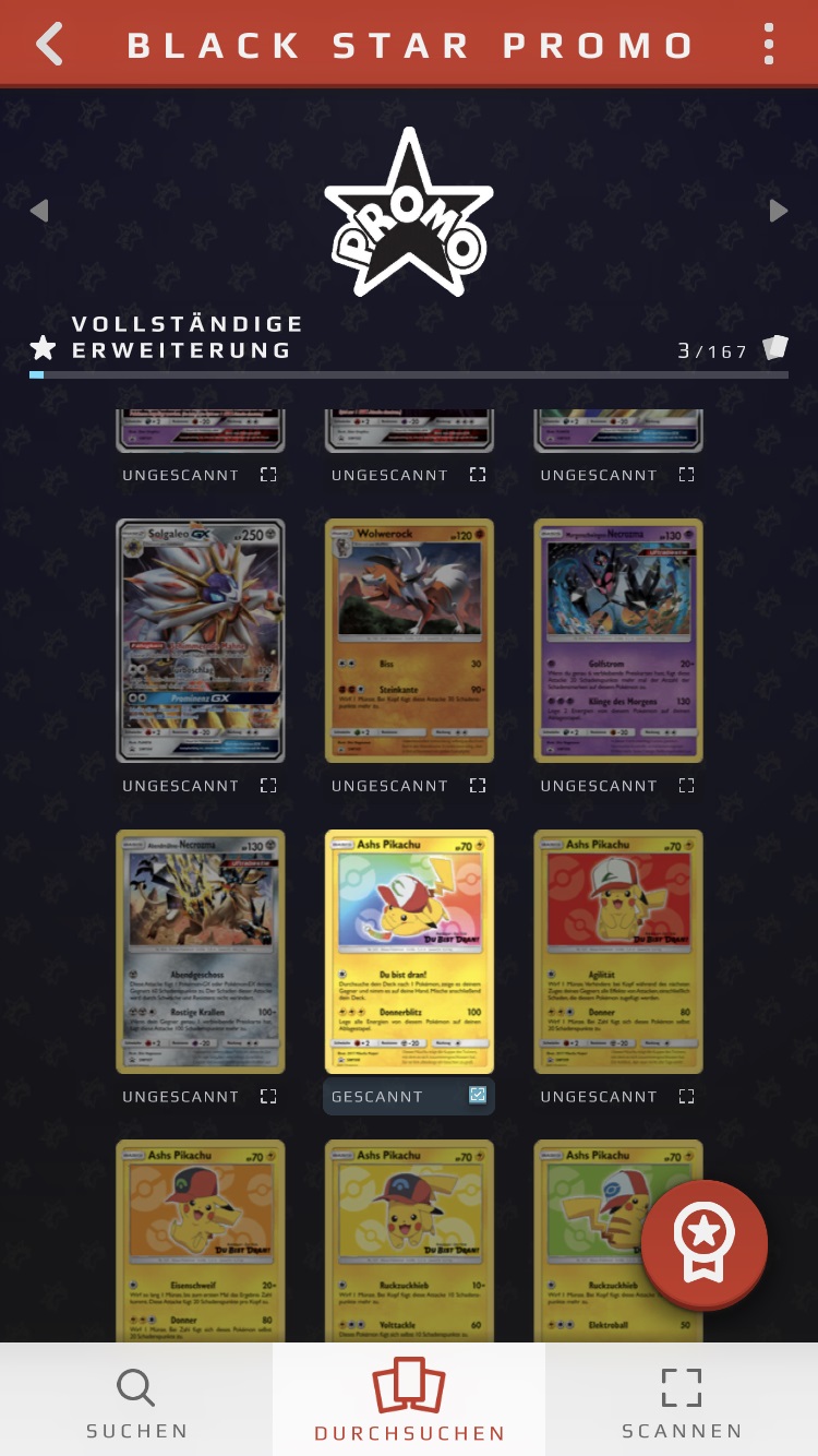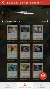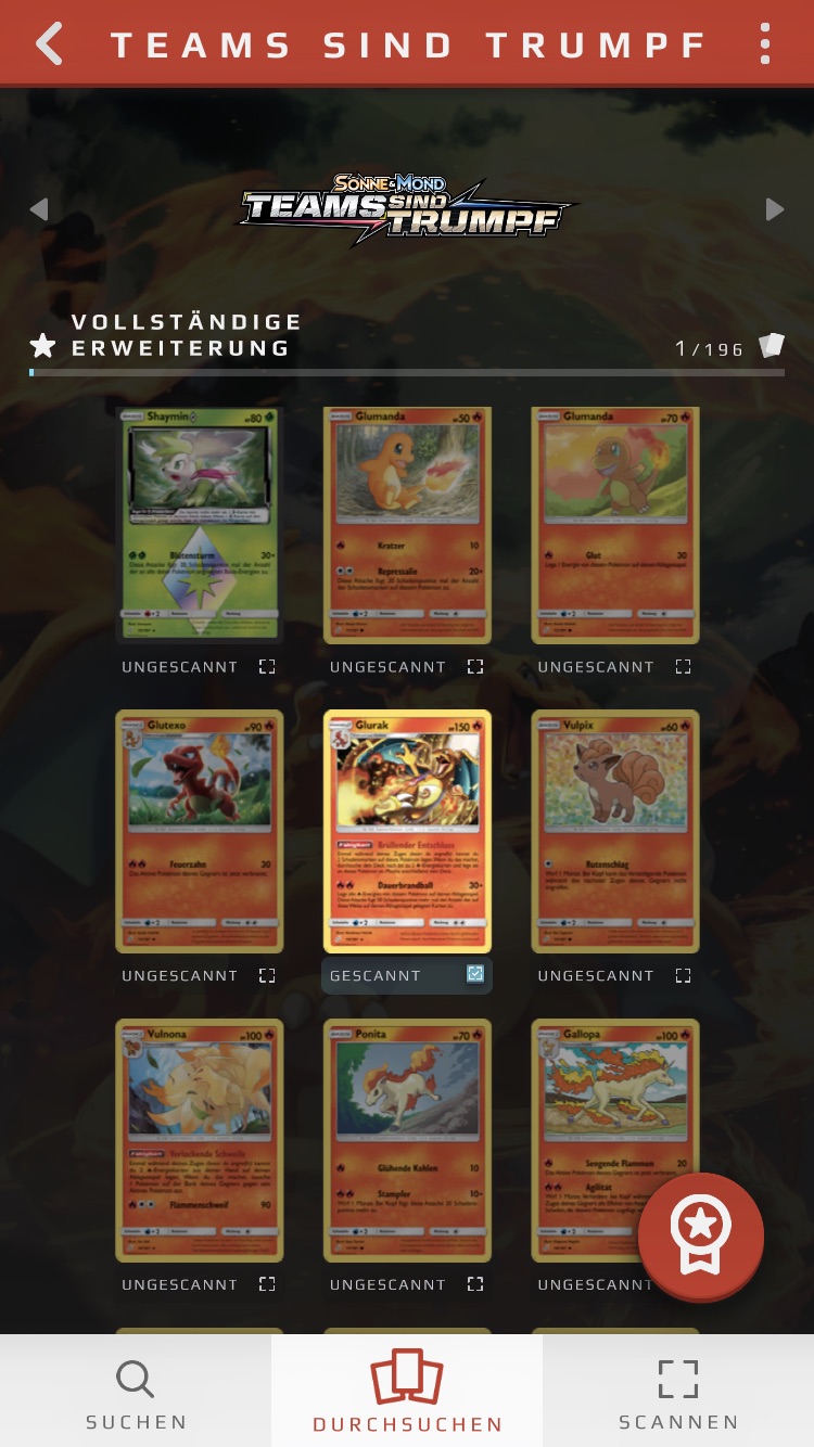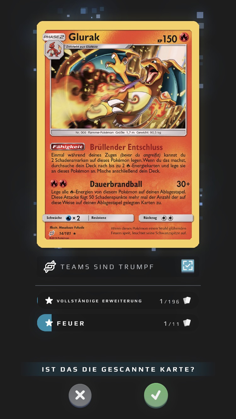 Karten, die ihr bereits als in eurem Besitz befindend markiert habt - entweder manuell oder durch einen Scan - werden im Vergleich zu den anderen Karten hervorgehoben, zudem findet ihr unter der Karte den Vermerk „gescannt“ und ein kleines blaues Häkchen. Ihr könnt diesen Status jederzeit manuell durch eine Berührung dieses Vermerks unter der Karte oder, indem ihr die Karte berührt und anschließend unten rechts den blauen Haken entfernt, ändern.