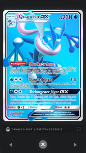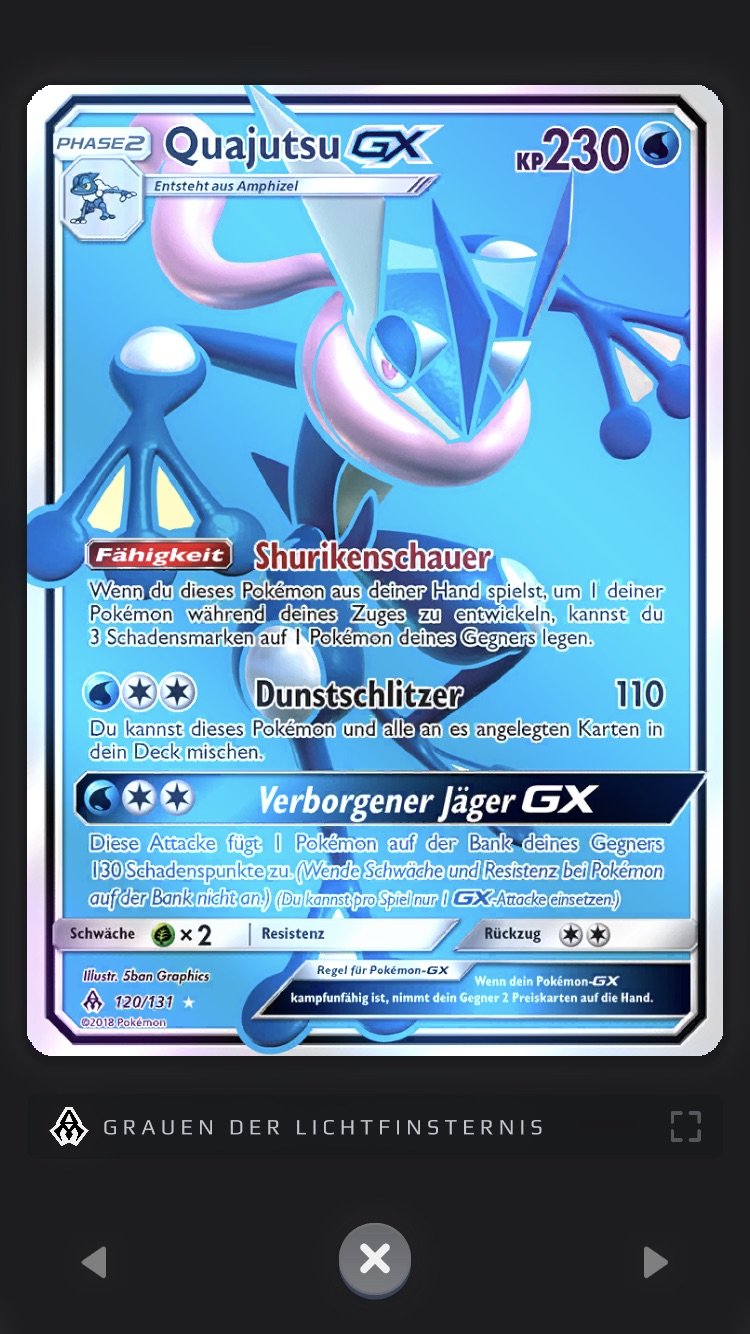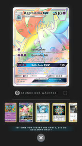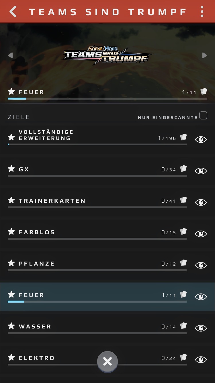 Über das kreisrunde, rote Symbol rechts unten in der Kartenansicht könnt ihr euch Statistiken zur Erweiterung anzeigen lassen: So seht ihr euren Sammelfortschritt und wie viele Karten der Erweiterung bzw. einer bestimmten Art (GX, Trainerkarten oder Typ) ihr bereits besitzt. Mit einem Klick auf eine dieser Kategorien könnt ihr euch auch die jeweiligen Karten anzeigen lassen.