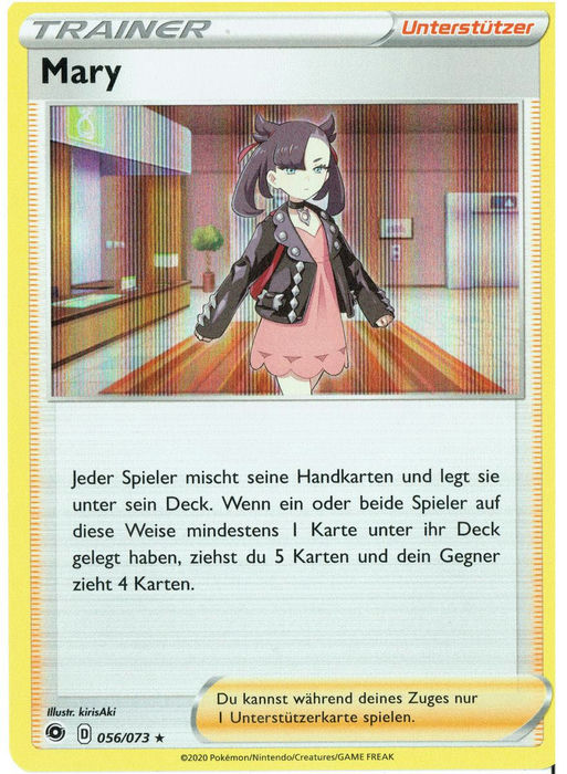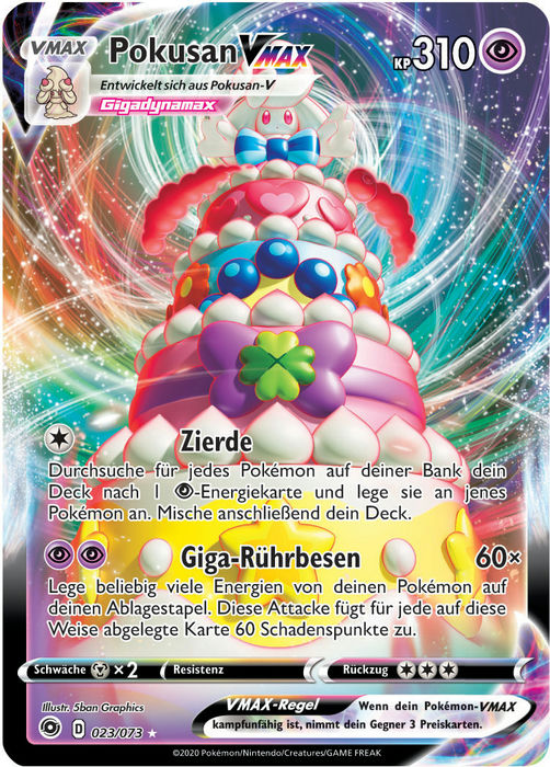 Auf dieser Seite stellen wir die Karten aus der Zusatz-Erweiterung von Schwert & Schild - Weg des Champs vor. Insgesamt sind 80 Karten in diesem Set enthalten, darunter 15 Pokémon-V, drei Pokémon-VMAX, mehr als 19 Trainerkarten sowie eine Spezial-Energiekarten. Darüber hinaus sind vier Vollbild-Pokémon-V und eine Vollbild-Unterstützerkarte enthalten. Die Erweiterung kann lediglich über spezielle Kollektionsboxen gekauft werden.
