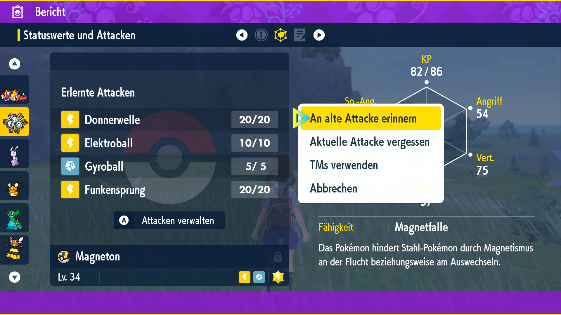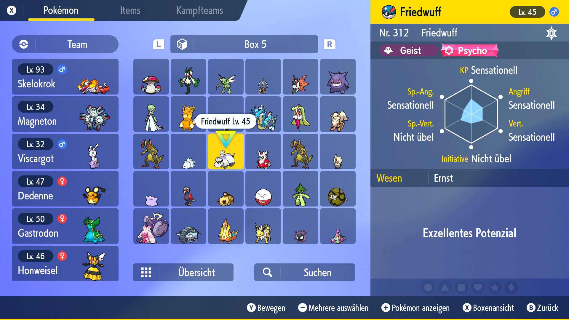 Habt ihr erfolgreich die Top 4 und den Champ besiegt, wird die Richter-Funktion freigeschaltet. Diese kann direkt in eurer Pokémon-Box genutzt werden indem die +-Taste gedrückt wird. Tut ihr dies, öffnet sich auf der rechten Seite der Box-Ansicht eine Analyse des ausgewählten Pokémon.