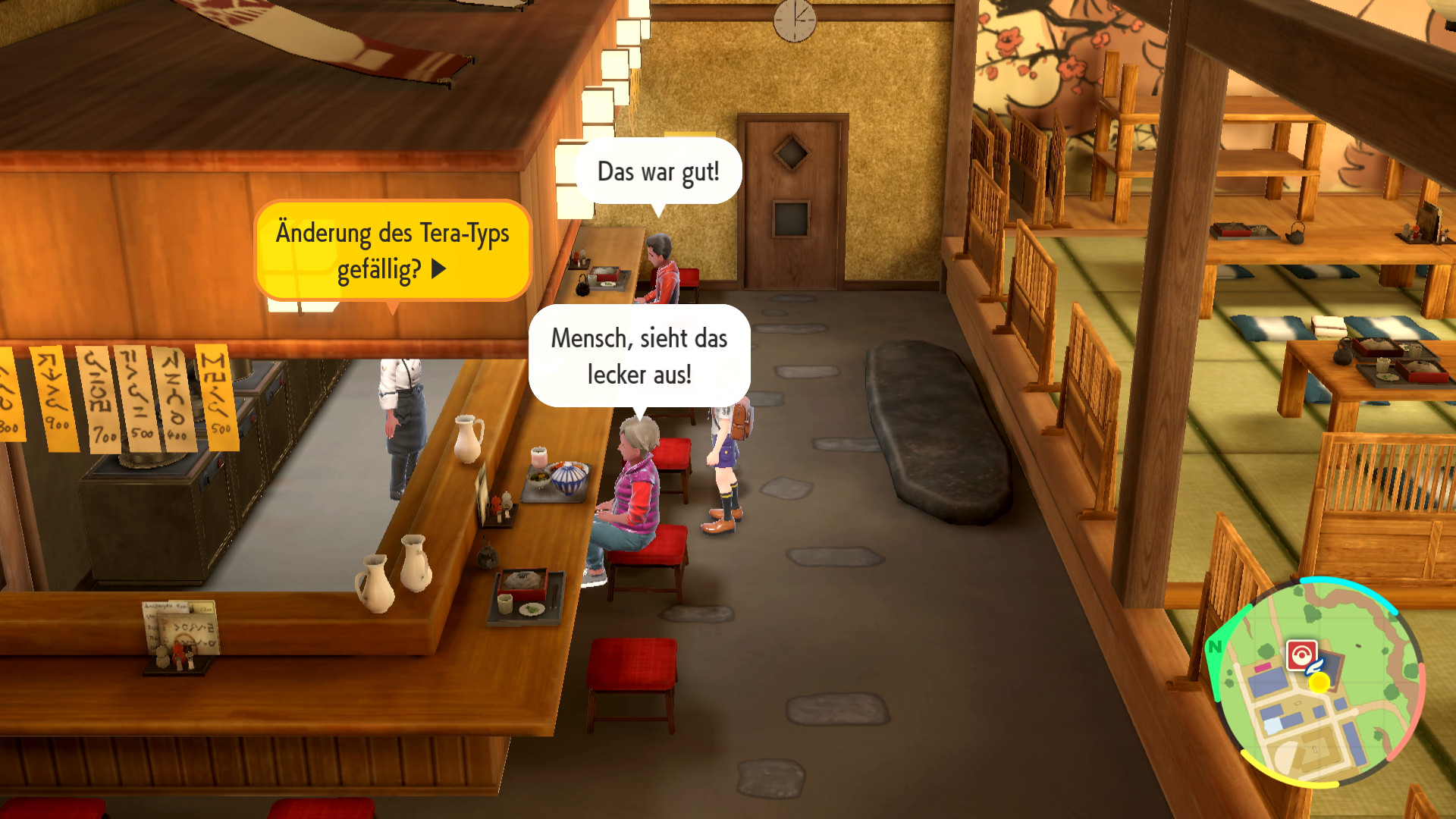 In Mesclarra befindet sich ein großes Restaurant im Osten der Stadt. Geht man in dieses Restaurant und spricht dort mit dem Chefkoch bietet dieser einem an den Tera-Typen eines Pokémon zu ändern. Dies macht er jedoch nur im Austausch gegen 50 Tera-Stücke des gewünschten Typs. Wenn man also einem Pikachu den Tera-Typen Feuer geben möchte, benötigt man hierfür 50 Tera-Stück (Feuer), welche durch das erfolgreiche Abschließen von Raids mit einem Pokémon mit Tera-Typ Feuer erhalten werden können. Besucht ihr das Restaurant zum ersten Mal nach eurem Sieg über Aoki schenkt er euch 50 Tera-Stück (Normal).