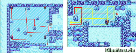 Dieser Pfad führt nach Ebenholz City. Also zieht euch warm an ;). Hier findet ihr folgende Items: Top-Trank, Hyperheiler, Ewiges Eis, Protein, Eisen, KP-Plus, TM44 Erholung und die VM07 Kaskade! Trainer gibt es hier keine, allerdings gibt es hier Eisflächen und es ist nicht immer einfach, sie zu meistern. Hier die Lösungen: