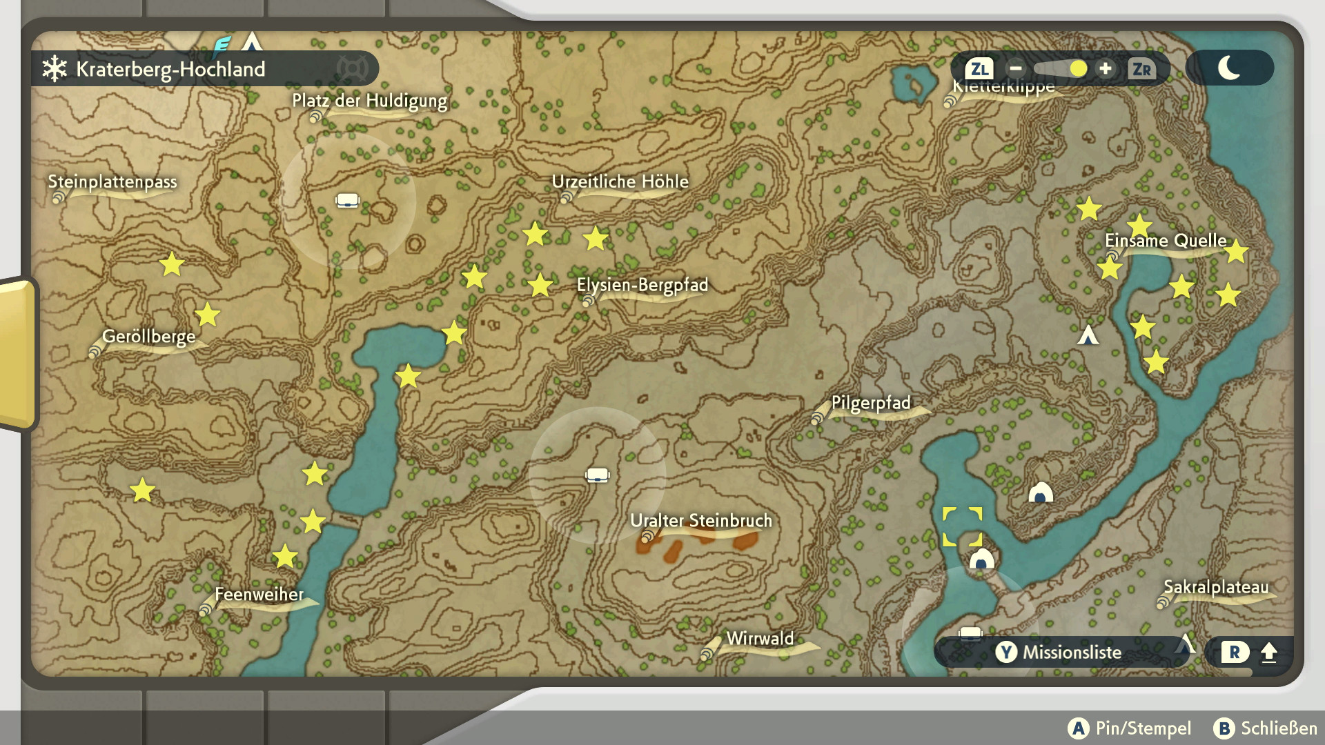 Da es im Obsidian-Grasland nur zwei Bäume gibt an denen die beiden Pokémon erscheinen können und der Weg zu ihnen sehr lange dauert, da kein Flugpukt in unmittelbarer Nähe ist, kann es etwas dauern, bis ihr dort die beiden Pokémon finden könnt.