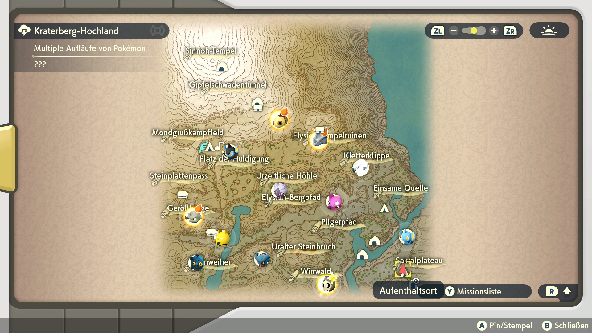 Auf der Karte des Gebiets kann eingesehen werden wo sich multiple Aufläufe befinden. Die Orte der Aufläufe sind durch Fragezeichen markiert, sodass nicht direkt eingesehen werden kann welche Pokémon sich wo befinden. Mit Hilfe von 5 n kann das Mampfaxo von Yona, welches an jedem Basislager-Eingang zu finden ist, die Sicht auf die Karte freischalten. Ab diesem Zeitpunkt kann eingesehen werden wo sich welche Pokémon befinden.