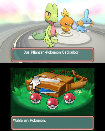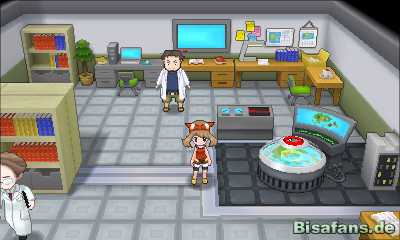 Schließlich könnt ihr euch in das Labor von Professor Birk begeben. Dort jedoch findet ihr nur einen leeren Platz vor. Sucht den Professor also in der Umgebung. Ihr werdet ihn schließlich auf der ersten Route im Norden von Wurzelheim finden(andere Bewohner wollen Schreie von dort gehört haben). Er ruft euch schließlich zu, dass ihr ihn von dem wilden Fiffyen retten sollt. Schnappt euch dazu ein Pokéball aus der Tasche des Professors, die vor euch am Boden liegt, und sucht euch euren Starter aus. Hier habt ihr die Wahl zwischen