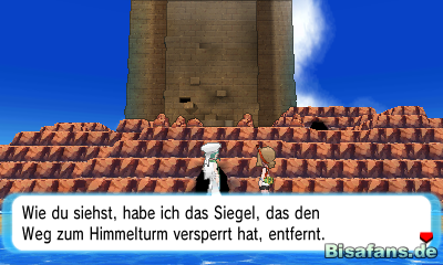 Im Himmelsturm angekommen trefft ihr wieder auf Amalia, welche euch nun auf dem Weg nach oben begleitet und euch mehrere Geschichten zu früheren Geschehnissen erzählt. Sie erklärt wie die Mega-Entwicklung entstanden ist und weitere interessante Hintergrundinformationen. Sammelt auf dem Weg nach oben das Item ein, welches ihr auf der ersten Ebene findet. Auf der dritten Ebene liegt links außerdem die TM64 Explosion. Dort liegt eine Drachenhaut. Ein paar Stufen weiter oben findet ihr zudem noch ein Top-Genesung. Ganz oben auf der Spitze des Turmes angekommen begrüßt euch Amalia und beschwört schließlich das Rayquaza an der Spitze des Turmes.