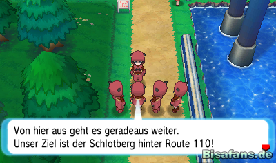 Auf dieser Route angekommen erblickt ihr sofort den großen Küstenradweg. Da ihr leider noch kein Fahrrad besitzt könnt ihr die Abkürzung hierrüber leider nicht nutzen und müsst einen kleinen Umweg über die reguläre Route nehmen. Folgt also dem Weg Richtung Norden bis ihr auf eine Gruppe Team Magma-Mitglieder trefft. Diese besprechen gerade ihren Plan zum Schlotberg zu gehen und begeben sich dann auf den Weg dorthin. Folgt dem Weg bis zu dem Rätselhaus und biegt, wenn ihr wollt, links ab. Ihr kommt dort auf Route 103, die jedoch keine Pflichtroute ist.