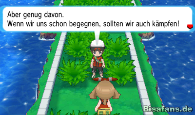 Biegt nun rechts ab und folgt dem Weg. In einer Kurve findet ihr das Item Angriffplus. Folgt dem Weg weiter nach oben bis ihr schließlich auf euren Rivalen trefft. Dieser fordert euch auf der Stelle zu einem Kampf heraus. Besiegt ihn um die Route weiter überqueren zu können.