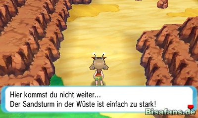Weiter oben auf der Route müsst ihr schließlich die VM Zertrümmerer einsetzen, um weiter vorankommen zu können. Zerschlagt die Steine und geht weiter nach oben. Nach einiger Zeit stehen rechts zwei Interviewer, denen ihr ein Interview für das Video-Navi geben könnt, sobald ihr sie besiegt habt. Folgt der Route weiter und biegt vor der Wüste links auf Route 112 ab. Da der Sandsturm in dieser Wüste zu stark ist, könnt ihr diese noch nicht durchqueren.