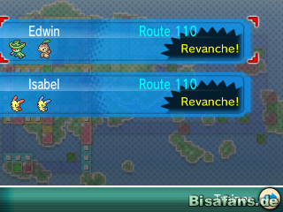 - Auf dieser Karte werden alle Trainer angezeigt, die eine Revanche haben wollen. Ihr könnt über die jeweiligen Trainer Informationen erhalten und Anzeigen zu dem Team, welches beim ersten Kampf genutzt wurde. Auch von hier aus könnt ihr euch direkt auf ein Flug-Pokémon setzen und zu dem Ort fliegen.