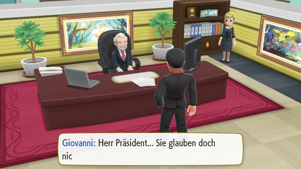 Gewinnt ihr, verschwinden sie. Danach könnt ihr in das Büro des Präsidenten gehen, in dem ein Gespräch zwischen ihm und Rocket-Boss Giovanni stattfindet. Giovanni hat den Auftrag gegeben, dass die Silph Co. Mitarbeiter einen Ball herstellen sollen, der jedes Pokémon fängt. Der Präsident will jedoch nicht für Giovanni produzieren und verweigert ihm den Ball. Empört darüber und über euer erscheinen fordert er euch zum Kampf heraus. Achtet auf seine starken Pokémon. Sollten diese euch jedoch nichts anhaben und ihr erfolgreich gegen Giovanni gewinnen, verschwindet er und auch Team Rocket aus dem Gebäude und ihr habt es erfolgreich befreit. Als Dank dafür schenkt euch der Präsident den Prototypen des Meisterballs, der einzigartig ist. Außerhalb des Gebäudes trefft ihr auf euren Rivalen, der Atlas verfolgte und zurück kam, als Team Rocket aus Saffronia floh.