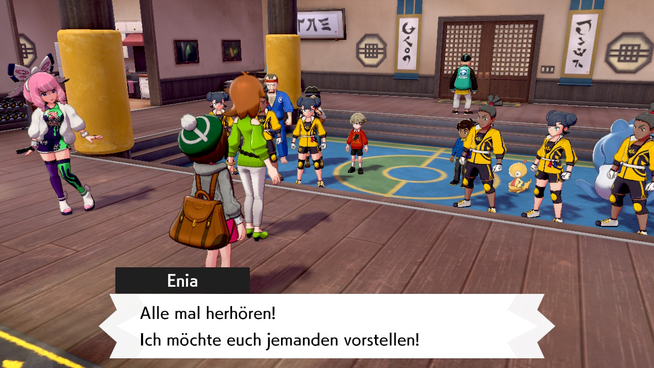 Dort begrüßt uns sogleich eine Professorin, die unseren Rotomdex aufwertet, sodass auf der Rüstungsinsel heimische Pokémon in einem eigenen Dex angezeigt und katalogisiert werden. Nachdem wir das Gebäude verlassen haben, erwartet uns mit Sophora in Pokémon Schwert und Saverio in Pokémon Schild ein bekanntes Gesicht vom Brassbury-Bahnhof, als dort vor einiger Zeit ein Galar-Flegmon aufgetaucht ist. Da sie schon längere Zeit im heimischen Dojo trainieren, stellen sie sich als unsere Mentoren vor. Auch wenn wir das nicht so recht glauben können, fordern sie uns zum Kampf heraus.