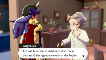 Auf Route 2 erklärt euch Hop, dass ihr für die Arena-Challenge eine Empfehlung von einem bekannten Trainer braucht und er hofft, dass er eine von dem Pokémon-Professor erhält, da ihm Delion keine gibt. Danach möchte er uns zeigen, wie man Pokémon fängt, jedoch erscheint augenblicklich Delion und erklärt es. Als Geschenk gibt er uns 20 Pokébälle, damit wir ordentlich Pokémon fangen können. Route 2 bietet so einige neue Pokémon für euer Team, also haltet Ausschau! Lauft oben zum roten Schild, um 2 Tränke davor zu finden. Kurz darauf müsst ihr euch rechts halten, um 3 Pokébälle zu finden. Auf dem Weg zum Haus des Professors finden einige Kämpfe statt, die eurem Team keine großen Probleme bereiten sollten. Kurz vor dem Haus findet ihr neben dem Grasfeld rechts eine unsichtbare Sprühdose Schutz. Betretet das Grundstück, wo schon Hop auf uns wartet. Auch Delion und die Pokémon-Professorin erscheinen und sie stellt sich als Pokémon-Professor Magnolica vor, die sich dem Dynamax-Phänomen widmet. Als Hop den Empfehlungsbrief anspricht, meint Delion, dass wir einen Kampf bestreiten sollen, um zu sehen, ob wir das Potenzial für die Arena-Challenge haben. Verlasst also wieder das Haus und sammelt noch ein paar nützliche Items vor dem Kampf ein. Lauft nach rechts und hinter das Haus, um TM 57 Gegenstoß zu finden. Kommt wieder vor das Haus und lauft links zwischen den Beeten lang, um neben dem Haus einen Superball zu finden. Vor dem großem Beet liegt versteckt eine Flasche Tafelwasser. Lauft dann auf das Kampffeld und startet den Kampf gegen Hop. Vorsicht, er besitzt nun auch ein Meikro und hat damit schon drei Pokémon. Der Kampf ist jedoch nicht allzu schwer, sodass ihr auch den mit Leichtigkeit gewinnen könnt. Nach dem Kampf erhaltet ihr von Delion das Empfehlungsschreiben und ihr könnt endlich an der Arena-Challenge teilnehmen. Kurz nach dem Erhalten fällt plötzlich eine rote Sternschnuppe vom Himmel, die sich in zwei Wunschsterne aufteilt. Professor Magnolica erzählt, dass sie nur besonderen Trainern vor die Füße fallen. Sania erscheint nun ebenfalls und lädt uns alle zum Essen ein.