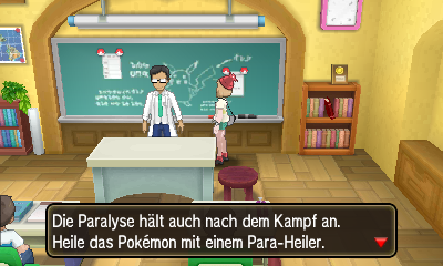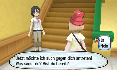 Durch die Lautsprecher der Schule werdet ihr schließlich in den ersten Stock der Schule gerufen – geht also die Treppe innerhalb der Schule hoch und sprecht mit der Leiterin. Sie möchte nun gegen euch antreten, nachdem alle ihre Schüler besiegt wurden. Nehmt die Herausforderung an und besiegt auch die Lehrerin Elke.