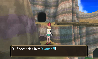 Draußen angekommen könnt ihr nach rechts unten gehen, um dort hinter dem Gras rechts einen Beleber zu finden. Geht anschließend nach links und geht über die kleine Überbrückung in Richtung des nächsten Eingangs. Schnappt euch neben dem Wegweiser das unsichtbare Item X-Angriff und betretet die nächste Höhle.