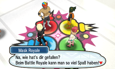 Folgt ihm in den Dome hinein und geht in Richtung der Rezeption. Kurz bevor ihr euch dort anmelden könnt, werdet ihr von Mask Royale begrüßt, der eine komische Ähnlichkeit mit Professor Kukui aufweist. Er lädt euch ein bei einem Battle Royale teilzunehmen und nutzt dazu die Anwesenheit von Tali und Gladio, um diese ebenfalls einzuladen. Ihr könnt euch kaum dagegen währen gegen die drei anzutreten. Kämpft also im Battle Royale gegen dir drei.