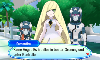 Nach dem Kampf verschwindet das Wesen wieder. Samantha murmelt vor sich hin, dass sie "es" befürchtet hatte und sie nie zulassen dürfen hätte, dass "das Kleine" entführt wird. Könnte sie damit vielleicht Cosmog meinen? Plötzlich erscheinen Cyonir und Mirin(UM) / Darus und Amamo(US) und sagen, dass es sich bei dem Wesen um eine Ultrabestie handelte. Die beiden Ultraforscher stellen sich euch erneut vor. Sie erzählen, dass ihre Welt in Dunkelheit gehüllt ist, obwohl es einst vom selben Licht erfüllt war wie Alola. Der Spender dieses Lichtes - seine Lumineszenz - hieß Necrozma, hatte jedoch auch eine wilde Seite. Wenn sie es nicht aufhalten, würde es irgendwann auch das Licht dieser Welt verschlingen. Samantha erklärt jedoch, dass die Æther Foundation bestens gerüstet sei und nichts passieren könne.