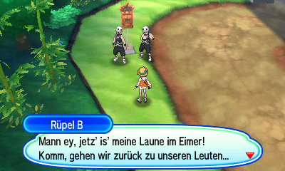 Geht zum Ende der Route, wo ihr auf zwei Team Skull Rüpel trefft, die an einem Busschild stehen. Sobald ihr in Rufnähe kommt, fordern sie euch zum Kampf heraus.