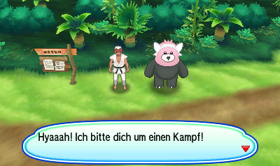 steht ein Mann, der euch sagt, wie viele Kämpfe ihr bereits bestritten habt und euch herausfordert. Wenn ihr ihn besiegt, schenkt er euch ein