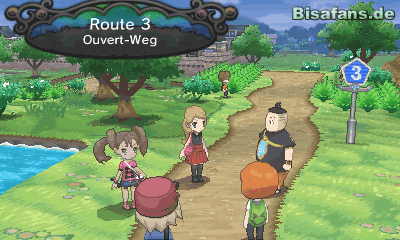 Hier bekommst du eine Abenteuerfibel von Kalem überreicht, die dir bei Problemen und Fragen weiterhelfen kann. Auf deinem Weg in die nächste Stadt triffst du nun auf weitere Trainer, gegen die du dich behaupten musst. Folge dem kleinen Umweg nach unten und springe über eine Anhöhe, um das Item Supertrank zu erhalten. Geht man die ersten Stufen hinunter sieht man sofort einen Busch wo man Zerschneider einsetzen kann. Dahinter befindet sich das Item Beleber.