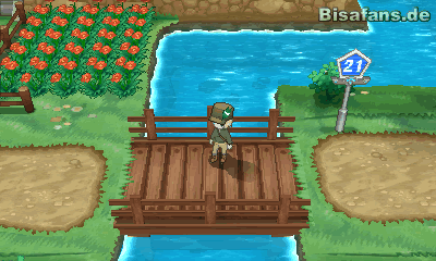 Gehe danach nach links in das Blumenfeld und setze deinen Itemradar ein. Auf einer kleinen freien Stelle findest du das Item Triperle. Danach kannst du mit Surfer auf das andere Ufer übersetzen und dort einen Wiederball finden. Zerschneidest du den Strauch im Weg, kannst du außerdem eine Giefebeere auf dem Boden sowie links oben an der Wand ein Elixier finden. Begib dich danach wieder zurück auf den Hauptweg, von dem du gekommen bist, und gehe ein paar Schritte nach links weiter. Du kannst schließlich eine Schräge nach unten laufen.