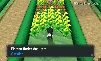 Du solltest unter allen Umständen auch die weiteren Trainerkämpfe bestreiten, da sie dir nicht nur Geld einbringen, sondern auch Erfahrung und EP für deine Pokémon. Durch den EP-Teiler kannst du natürlich noch einmal um einiges besser trainieren. Achte darauf, dass du dir das Item Giftstich aus der Mitte der Route (zwischen den grünen Wänden) nicht entgehen lässt! Des Weiteren findest du kurz vor Ende der Route ganz rechts das Item äther und links einen Netzball.