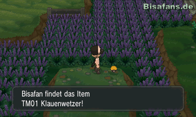 Hast du die Gegner erfolgreich besiegt, kannst du dem Weg nach unten durch das Blumenfeld folgen. Ganz unten links auf dem Berg findest du das Item X-Angriff. Schnapp es dir und gehe wieder durch das Blumenfeld ganz nach oben zu den Schienen. Die Schienen dort sind dieses Mal in der Mitte gebrochen. Um trotzdem über sie herüber zu kommen, musst du mit dem Schiebepad in die Richtung drücken, in die du fährst. Das heißt, dass du, wenn du von rechts nach links fahren willst, das Schiebepad nach links bewegen musst und, wenn du von links oben nach rechts unten fahren willst, das Schiebepad nach rechts unten schiebst. Als Belohnung für den Balanceakt bekommst du die TM01 Klauenwetzer in einem goldenen Pokéball! Zurück kannst du ganz leicht, indem du die Anhöhe hinunter springst. übrig bleiben noch drei weitere Trainerkämpfe.