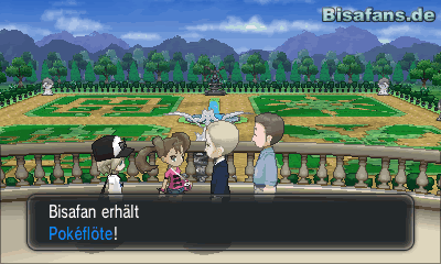 Neben der VM kannst du außerdem noch einen Supertrank und Gegengift finden. Das vermisste Pokémon findest du schließlich im oberen linken Teil des Gartens und bellt dich an, wenn du ihm näher kommst. Deine Aufgabe ist es nun das Pokémon in die Sackgasse zu treiben, um es fangen zu können. Stelle Sannah dazu zunächst auf den Punkt unten in der Mitte und bewege Coiffwaff nach oben. Stellst du Sannah nun auf den rechten Ausblickspunkt kannst du das Pokémon ganz leicht in die Sackgrasse führen und es dort fangen. Dort angekommen trifft der Inhaber des Palastes auf euch und bedankt sich herzlich. Er möchte dir eine Belohnung für die Hetzjagd geben und bittet dich deshalb in den oberen Teil des Palastes. Zu ihm gelangst du durch den langen Gang im oberen Teil des Gebäudes in dem es viele Fenster gibt. Auf der Terasse angekommen kannst du ein wunderschönes Feuerwerk betrachten. Frag gleich danach nach der Pokéflöte, die ihr für das Relaxo auf Route 7 braucht und lege sie in deine Itemtasche. Des Weiteren fragt euer Freund den Butler des Hauses nach den Mega-Entwicklungen der Pokémon aus und schenkt euch daraufhin die TM17 Schutzschild. Mit dem Hinweis, dass in der Bibliothek etwas zu den Mega-Entwicklungen stehen könnte verlässt auch er die Terasse wieder.