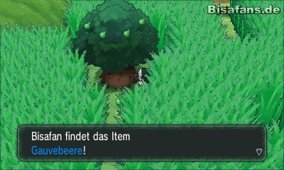 Weiter rechts oben findest du das Item Aufwecker, welches ein schlafendes Pokémon im Kampf wieder aufwecken kann. Gehst du von dort aus nach unten und hältst dich links, findest du einen großen Baum, an dem Gauvebeeren wachsen. Hebe eine Beere auf und lege sie in deine Itemtasche.