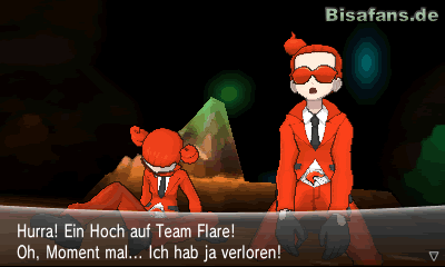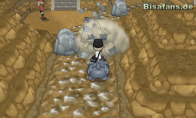 Wenn du die Höhle schnell durchqueren willst, musst du lediglich dem Weg folgen und nicht abbiegen, wenn du auch geradeaus laufen kannst. Bist du am Ende des Pfades angelangt, spricht dich eine Person in Rot an. Nachdem du nicht gehst, fordert er dich zum Kampf heraus und will dich so aus der Mine vertreiben. Er gehört einem so genannten Team Flare an, dessen Name du in Zukunft noch öfter hören wirst.