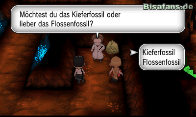 Kaum ein paar Schritte weiter begegnest du gleich zwei Team Flare Mitgliedern, die dich zum Kampf heraus fordern. Zum Glück erscheint Kalem und unterstützt dich bei dem Kampf! Hast du alle Pokémon besiegt, kannst du schließlich bis an das Ende der Höhle gehen. Kurz bevor du mit dem Forscher reden kannst, findest du das Item Fluchtseil in seiner Nähe. Sprich den Forscher zusammen mit Kalem an und frag ihn über das Team Flare aus, das euch im Weg stand. Da der Professor so auf seine Fossilien fixiert ist schenkt er dir schließlich ein Kieferfossil (Balgoras) oder ein Flossenfossil (Amarino). Wähle eines der beiden Fossile aus. Da ihr auch aus dieser Person nichts über die Mega-Entwicklungen oder das Team Flare herausfinden konntet, könnt ihr nun das Item Fluchtseil, das du kurz zuvor gefunden hast, einsetzen und dich wieder ans Training machen.