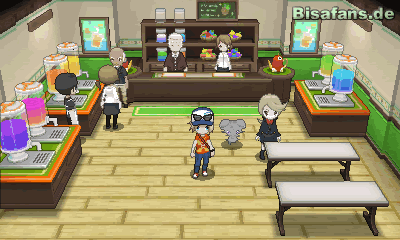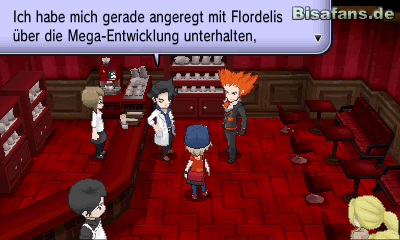Kaum aus der Arena kannst du dich nur kurz über deinen Sieg freuen. Du erhältst nach dem Verlassen des Gebäudes sofort eine Holo-Nachricht von Professor Platan in der er sagt, dass er dich im Bistro Flordelis treffen möchte, welches sich in einer Seitengasse der Herbstallee befindet. Um dir die Suche nach dem Bistro zu erleichtern, kannst du jedoch auch in einem Taxi zum Zielort fahren. Dort angekommen triffst du dich mit Platan und Flordelis. Letzterer schenkt dir schließlich einen King-Stein. Verlasse das Bistro nun wieder, um eine weitere Holo-Nachricht von Trovato zu erhalten. Dieser sagt dir, dass ihr euch alle auf Route 14 treffen wollt. Geh also noch einmal in ein Pokémon-Center bevor du dich in Richtung Route 14 begibst!