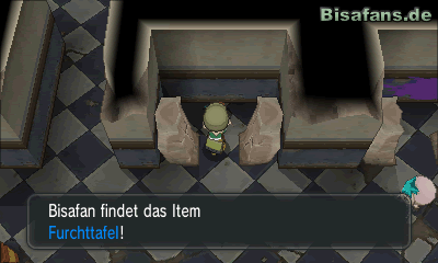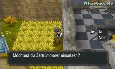 Kaum kommst du in die Ruine, kannst du beim zweiten Stein Zertrümmerer einsetzen, um an eine Furchttafel zu gelangen. Folgst du dem Weg bis ganz nach links, erhältst du dort die TM56 Schleuder von einer Rollerskaterin. Gehe dann nach oben und schließlich nach links, um hinter einer weiteren zerstörbaren Wand das Item Schützer zu finden.