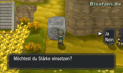 Folge dem Pfad anschließend und mache dir den Weg mit Stärke frei. Gehst du durch das Blumenfeld nach oben, kommst du schließlich an eine Stelle, an der du Surfer und Kaskade einsetzen kannst. Da du letztere Attacke jedoch noch nicht besitzt, um Wasserfälle erklimmen zu können, musst du später noch einmal wieder kommen, um den oberen Teil erkunden zu können. Sobald du ein Haus sehen kannst, solltest du zunächst nach unten gehen und hinter dem Blumenfeld einen Felsen wegschieben. Dieser gibt dir schließlich den Weg zu dem Item Fausttafel frei sowie einem versteckten Item im Stein. Dort findest du ein Sonderbonbon!