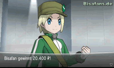 Mein Team bestand zu dem Zeitpunkt aus Glurak (67), Quajutsu (69), Viscora (51), Pandagro (62), Psiaugon (71) sowie Lucario (52), welches ich in mein Team geholt habe, um eine Schwäche auszugleichen. Da ich mit Lucario, Glurak du auch Quajutsu tolle Attacken gegen den Arenaleiter hatte, war es ein leichtes ihn zu besiegen. Etwas nervig war jedoch die Verwirrung, die durch Frigomentris Attacke hervorgerufen wurde. Pass gut darauf auf, dass dein Pokémon sich nicht ständig selbst verletzt!