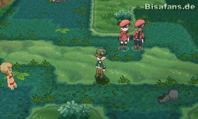 Bist du in der Stadt angekommen, musst du dich auf den Weg nach oben links machen. Dort stellt sich dir ein Team Flare Mitglied in den Weg – hast du es besiegt, kannst du dich auf den Weg in das Geheimversteck von Team Flare machen.